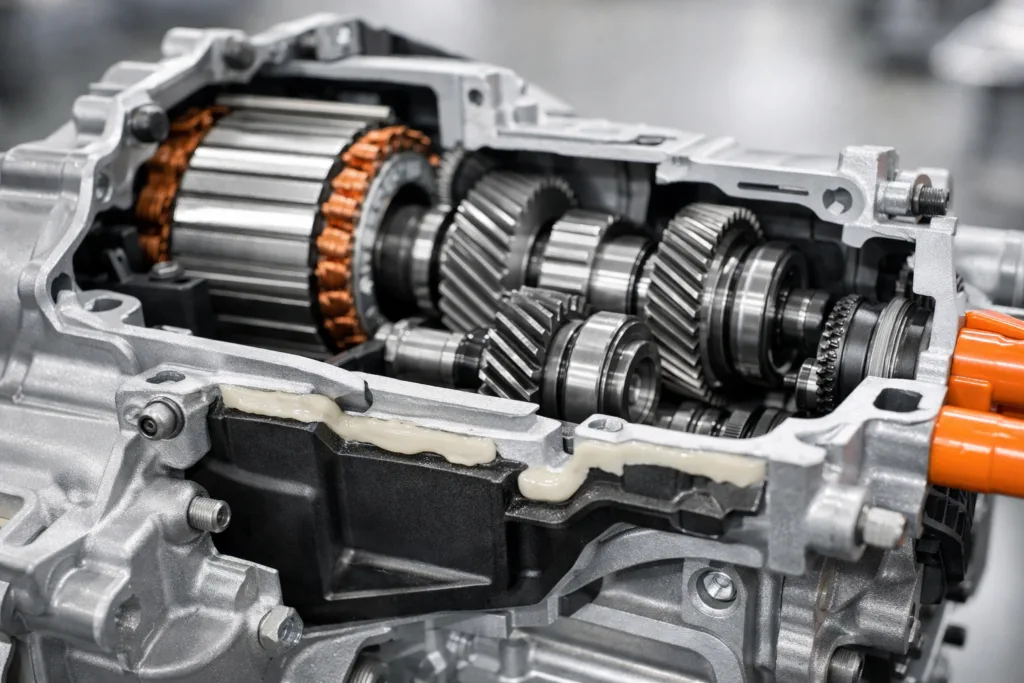 - Temperature Resistance: Electric drive units operate in high heat, sometimes exceeding 140°C. Adhesives must retain strength and elasticity.