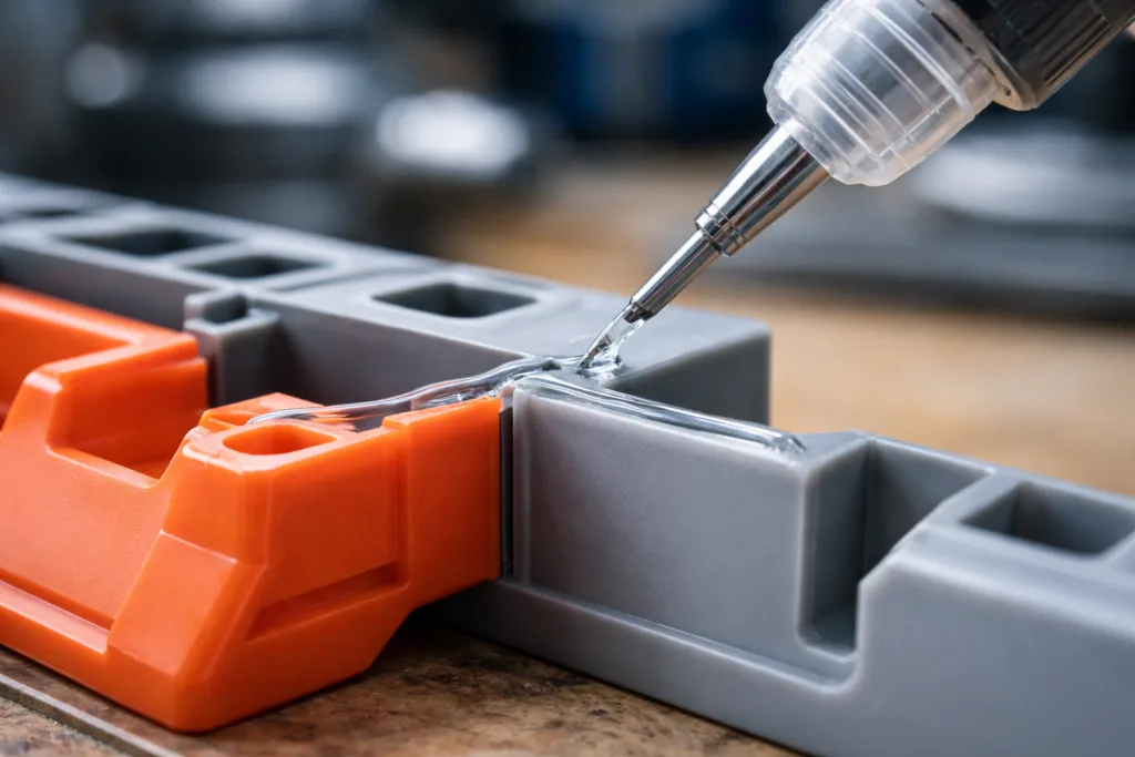 ABS, PC, PMMA, and PVC require less specialized chemistry. Household “Super Glue” (cyanoacrylate), 2-part epoxy, and solvent cements all work—each with tradeoffs around speed, clarity, and flexibility.