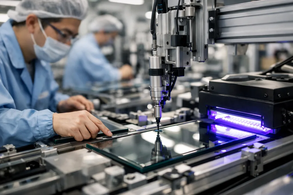 Process design shapes adhesive success as much as the chemistry. Best results come from automated, controlled dispensing—robotic bead application, slot-die systems for large panels, static mixers for dual-cure resins. UV lamps (LED or mercury) must match adhesive’s absorption for full cure. Clamping is needed to ensure thin, even bondlines.