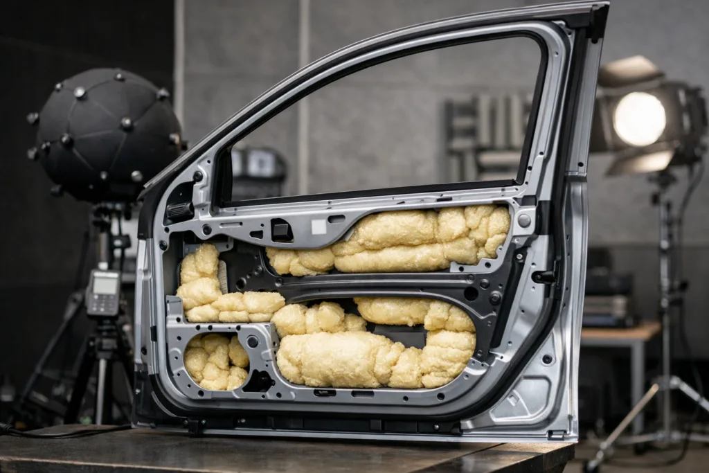 Several manufacturers now inject foamable adhesives inside EV door frames. These expand during the paint oven bake process, filling cavities and solidifying to reinforce structure. The result? A meaningful drop in door panel resonance and a more premium “thunk” sound when closing.