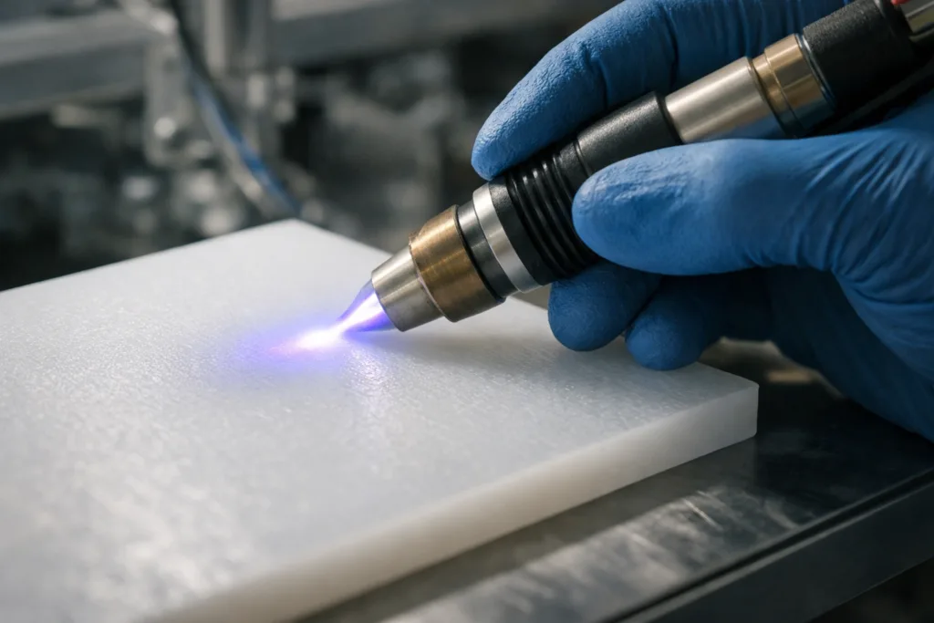- Flame Treatment / Corona Discharge: Raises surface energy in PP and PE, making them adhesive-friendly. Essential for process lines working with these plastics.