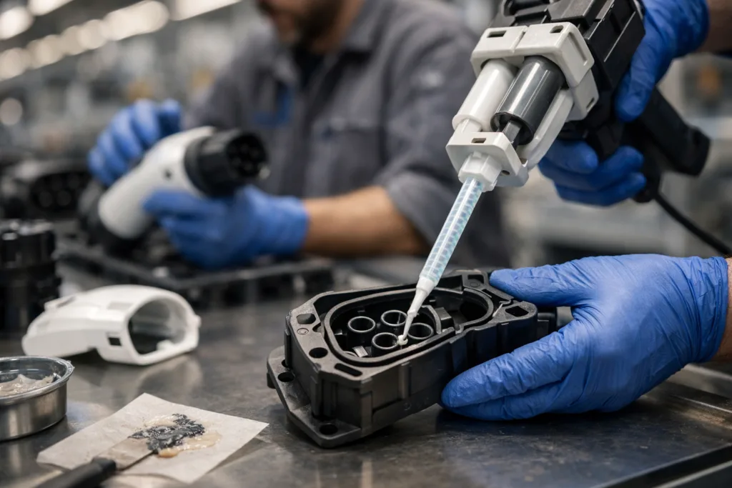 Charging guns and plugs require precise engineering. Adhesive selection affects assembly throughput, service life, and user safety. Key requirements include: