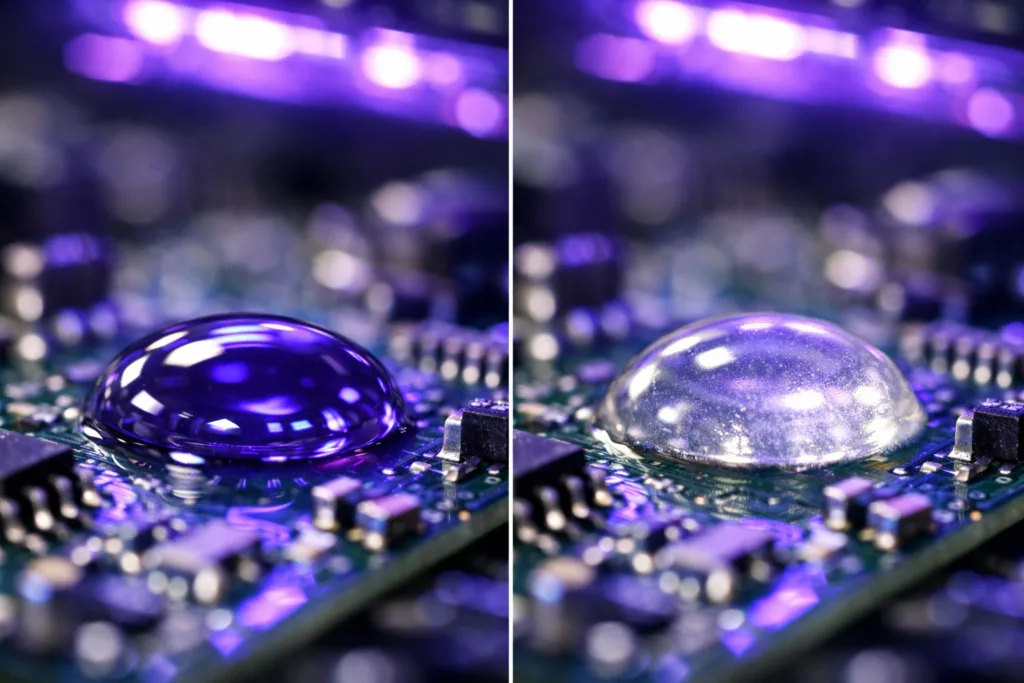 Before cure, UV adhesive looks like clear syrup. It can be dispensed precisely by automated machines or manually. Under UV lamp exposure, the transformation is fast—within seconds, the liquid turns into a solid bond. In some cases, you can see the adhesive flow stop and edges set as the light passes.